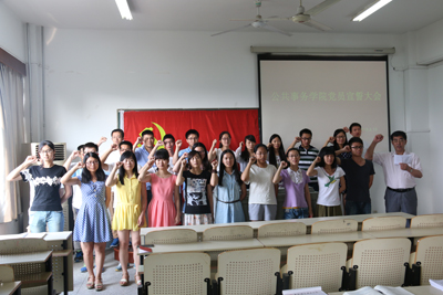6月19日,我院在南区公共事务学院楼401教室召开2015年党员集体谈话暨宣誓大会,全院26名新发展的学生党员深入学习党章和习总书记系列重要讲话精神和“三严三实”要求,并按照党章规定,带领学生党员在党旗下庄严宣誓。
